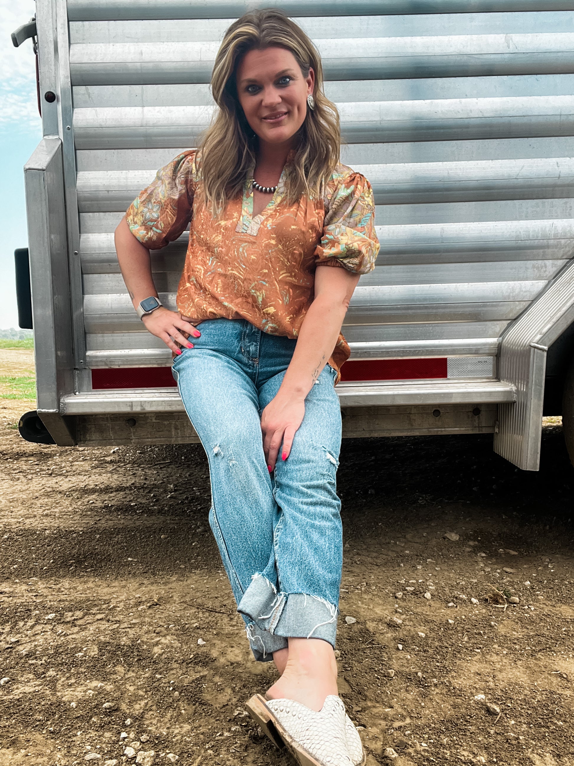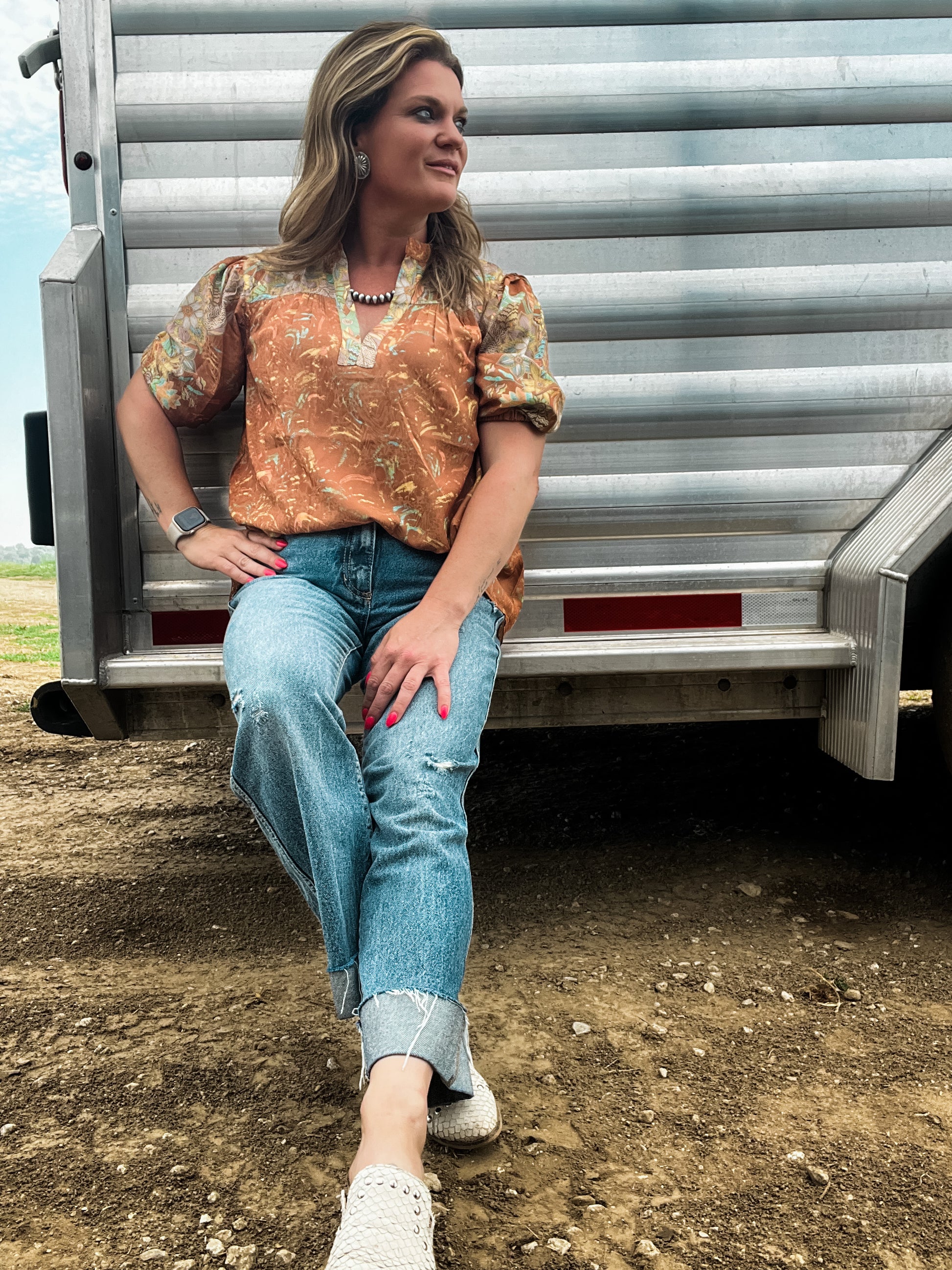 Border Print V-Neck Blouse