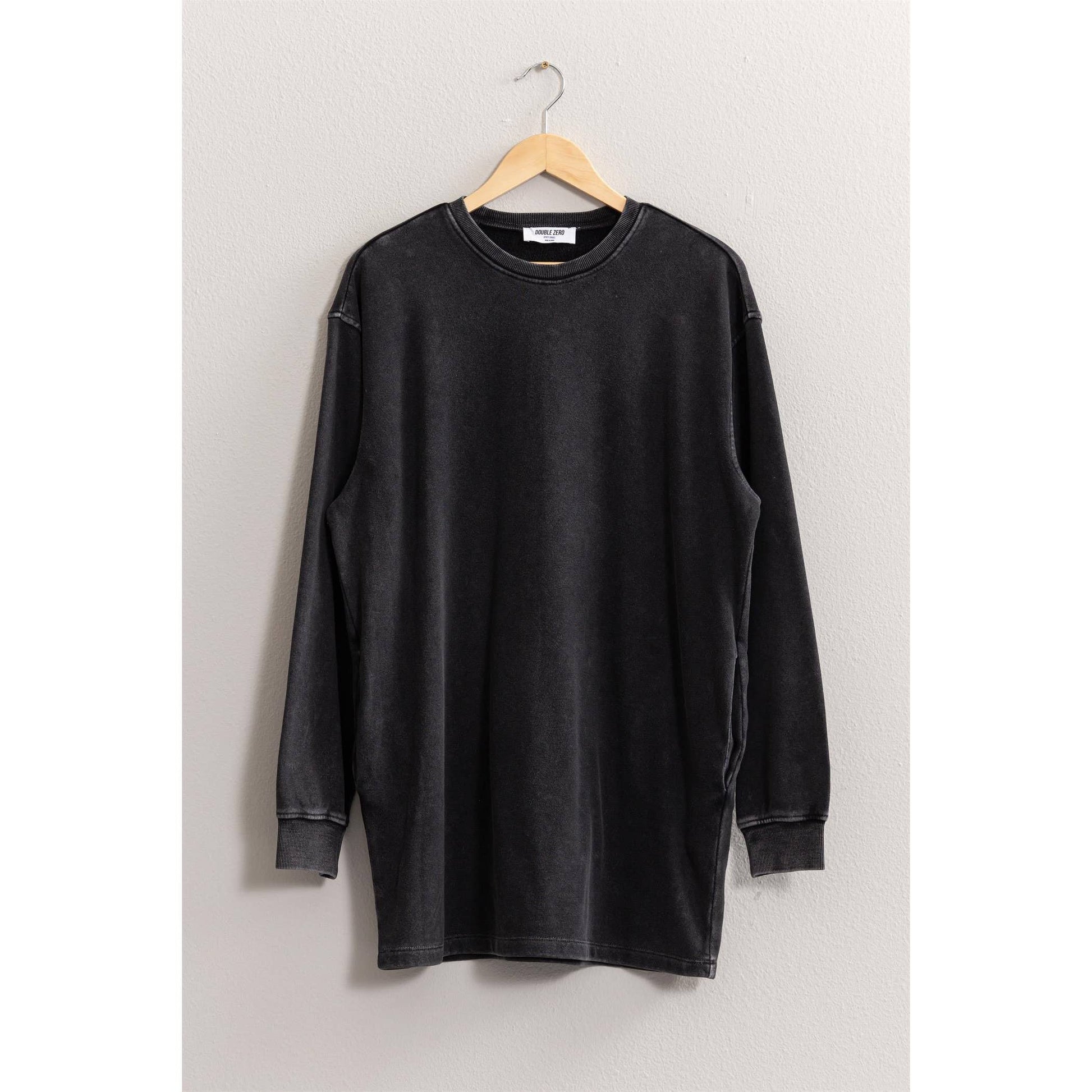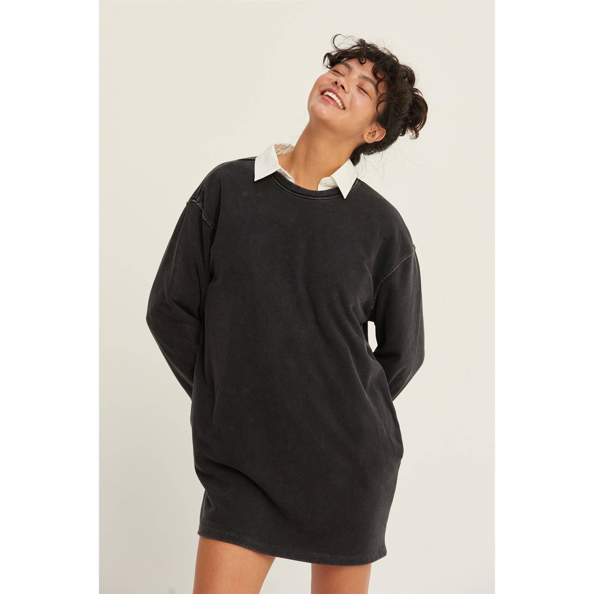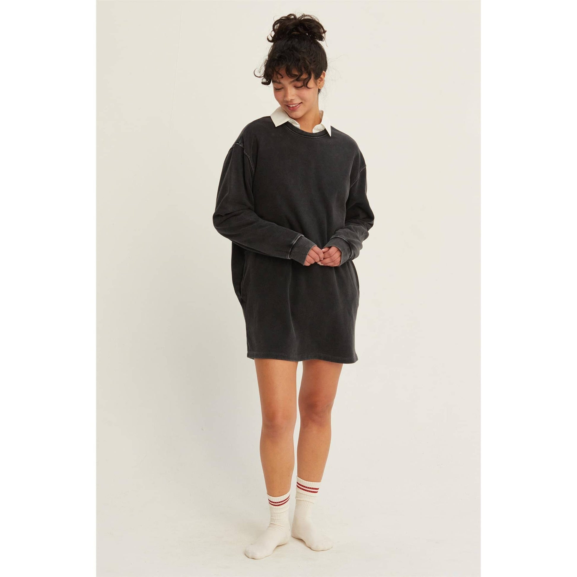 EMBRACE COZY COMFORT WITH THIS OVERSIZED SWEATSHIRT DRESS. DESIGNED FOR A RELAXED FIT, THIS DRESS FEATURES DROPPED SHOULDERS AND LONG SLEEVES, MAKING IT PERFECT FOR LOUNGING OR CASUAL OUTINGS. THE SOFT, WASHED FABRIC ADDS A TOUCH OF VINTAGE CHARM, WHILE THE SIMPLE, CLEAN LINES MAKE IT A VERSATILE ADDITION TO YOUR WARDROBE. PAIR IT WITH SNEAKERS OR BOOTS FOR AN EFFORTLESS, STYLISH LOOK. SELF: 80% COTTON 20% POLYESTER CONTRAST: 95% COTTON 5% SPANDEX MODEL IS 5' 7" TALL, 32" CHEST, 25" WAIST AND 36" HIPS AND WEARING A SIZE SMALL IMPORTED. DESIGNED IN THE USA