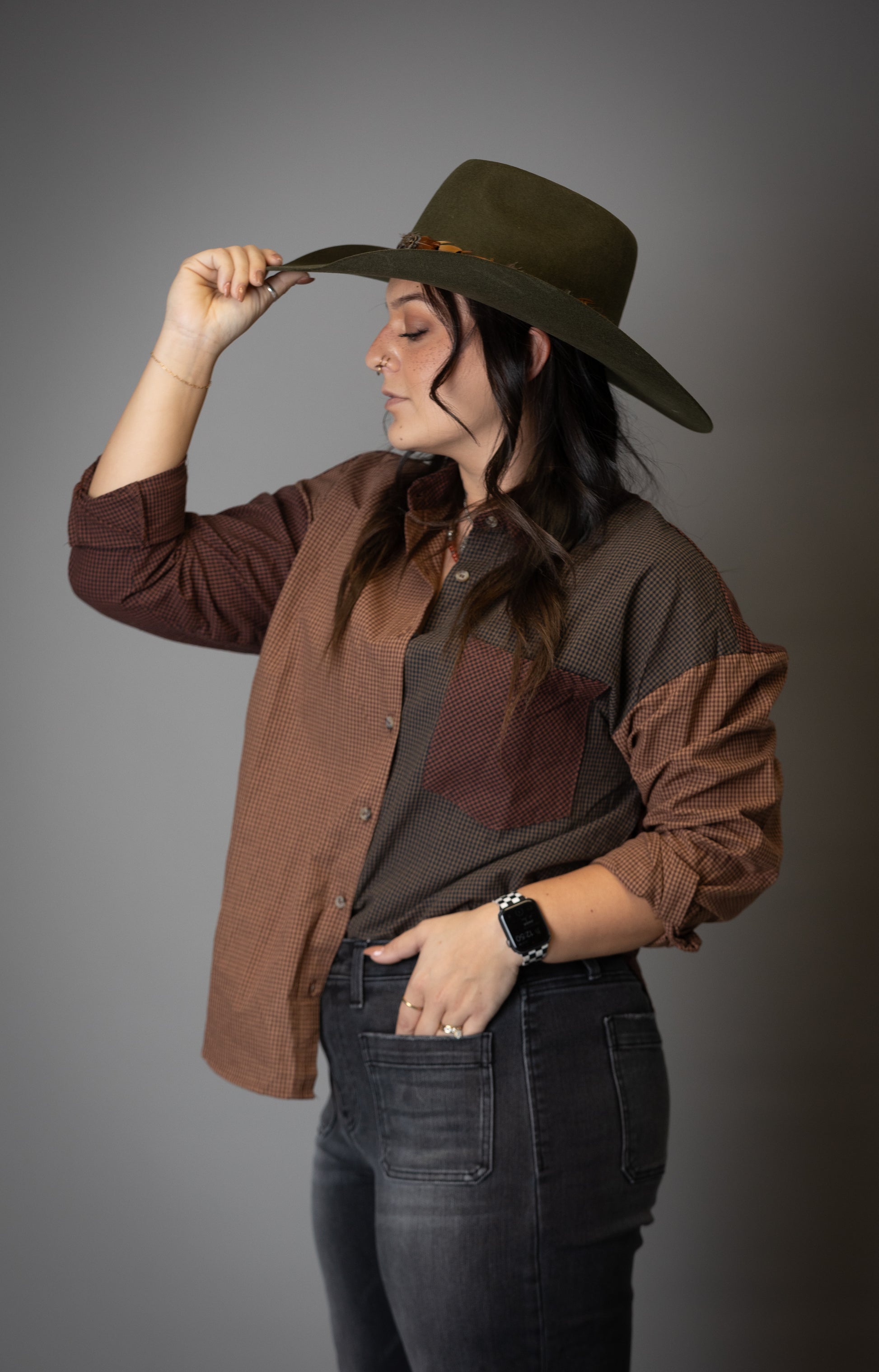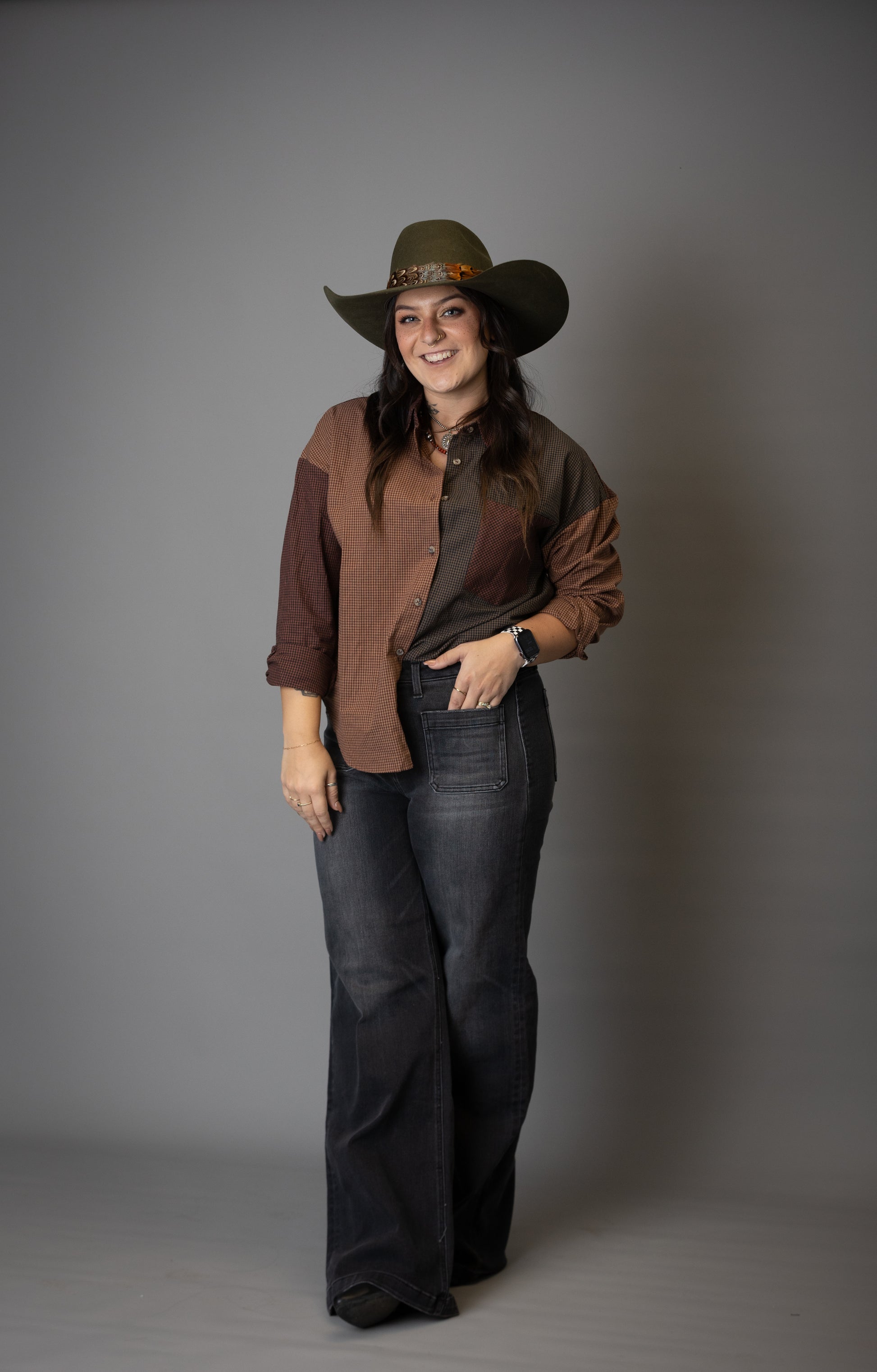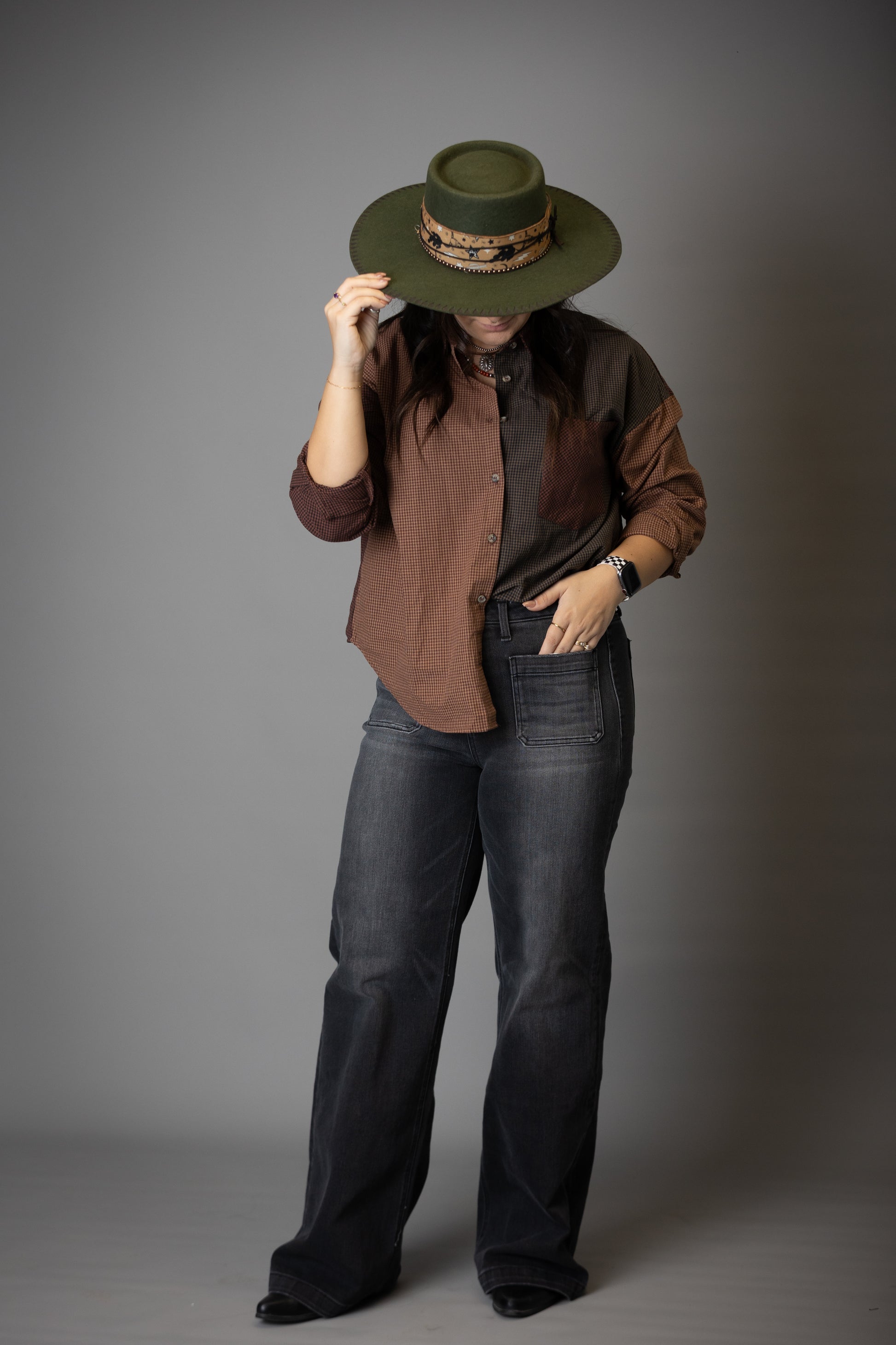 PLAID COLORBLOCK BUTTON DOWN TOP